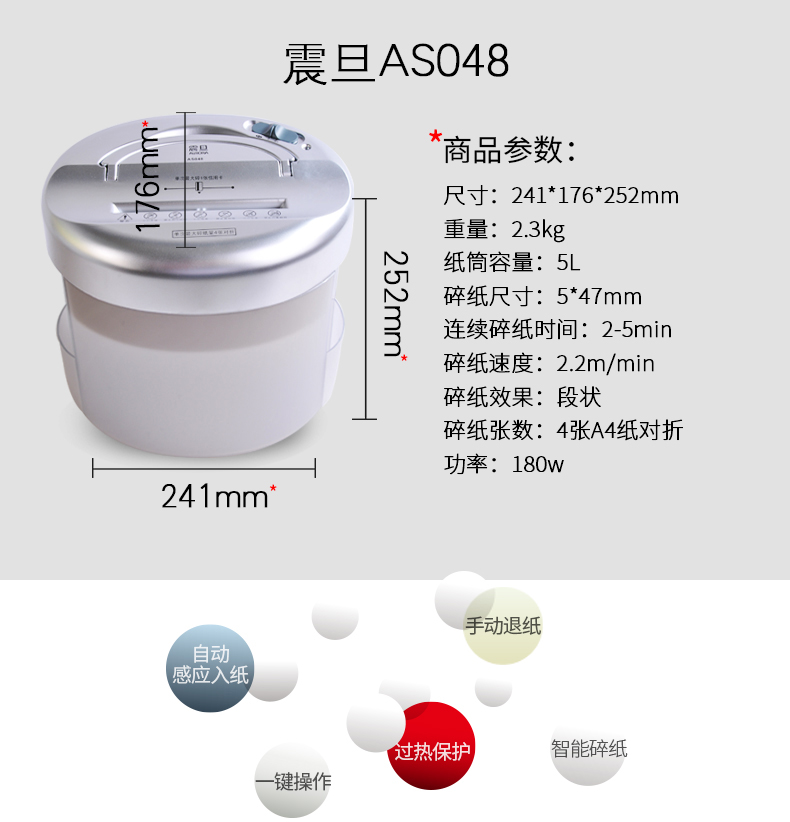 • 產(chǎn)品名稱:震旦AS048辦公碎紙機單次4張低音便攜小型家用桌面型迷你粉碎機
