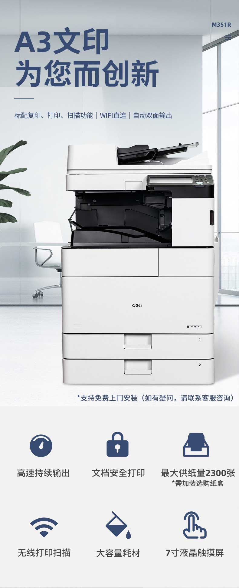 • 產(chǎn)品名稱:得力M351R A3黑白多功能數(shù)碼復(fù)合機大型商用辦公激光一體機打印機