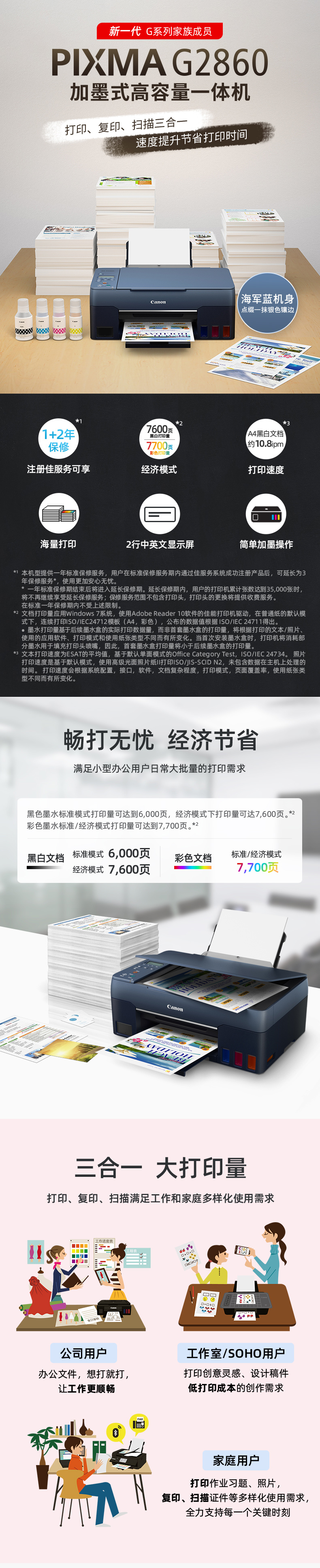 • 產(chǎn)品名稱:佳能 G2860大容量可加墨彩色多功能一體機(jī)(打印/復(fù)印/掃描)