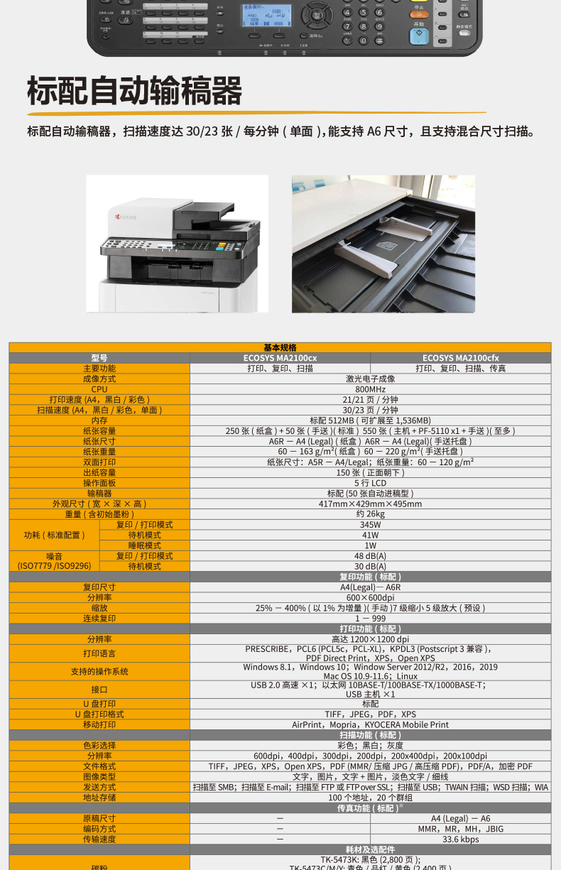 • 產品品牌:京瓷(KYOCERA)ECOSYS MA2100cx A4幅面彩色激光一體機(打印/復印/掃描)